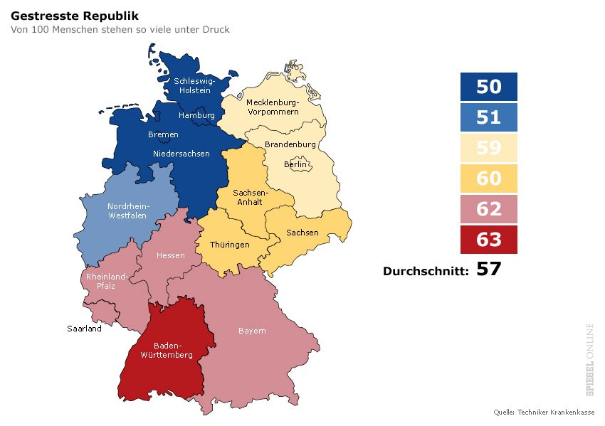 - Wohnort: Die Umfrage zeigt ein deutliches Nord-Süd-Gefälle der Entspanntheit: In Schleswig-Holstein, Hamburg, Bremen und Niedersachsen gaben nur 50 von 100 Menschen an, in ihrem Alltag unter Druck zu stehen. In Baden-Württemberg hingegen berichteten 63 von 100 Menschen von Stress im Alltag – dort wohnen die angespanntesten Deutschen. Ähnlich gestresst sind die Bayern, Rheinland-Pfälzer, Hessen und Saarländer. Der Osten bildet das Mittelfeld.